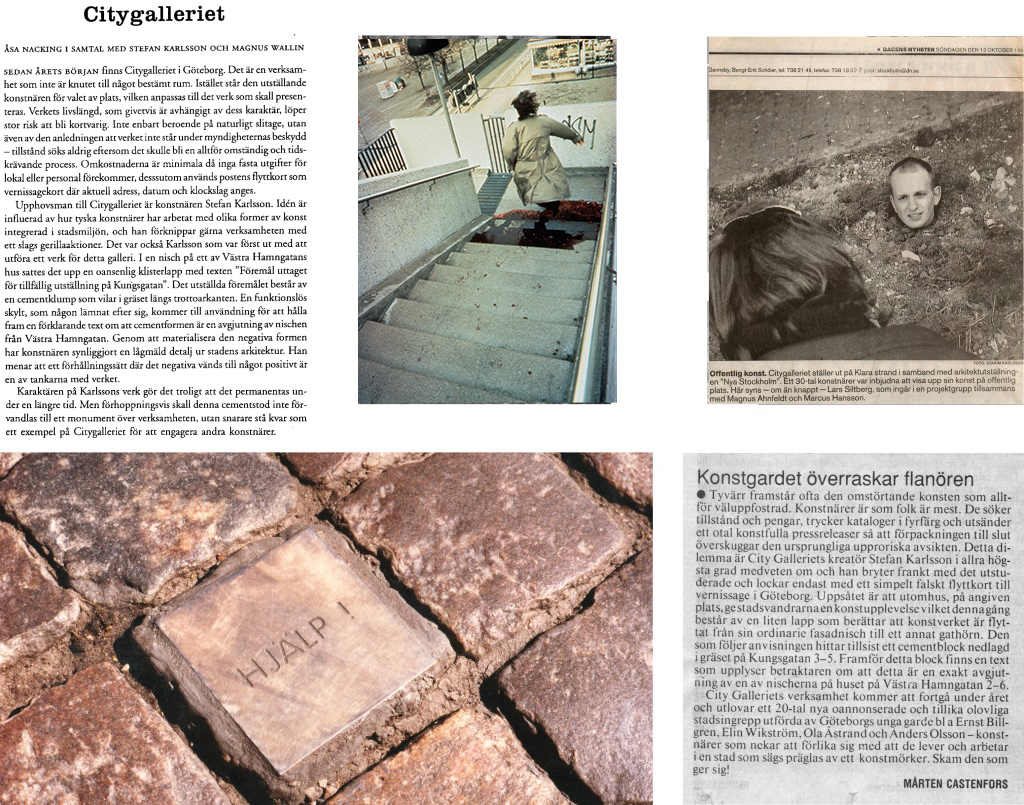 Efter ett par år i Stockholm började jag tröttna. Jag återvände till Göteborg och tog tag i det jag hade lärt mig i Berlin och i New York att organisera konstprojekt i samarbete med andra konstnärer. Citygalleriet var ett självorganiserat konstprojekt i Malmö, Göteborg, Stockholm och Oslo.